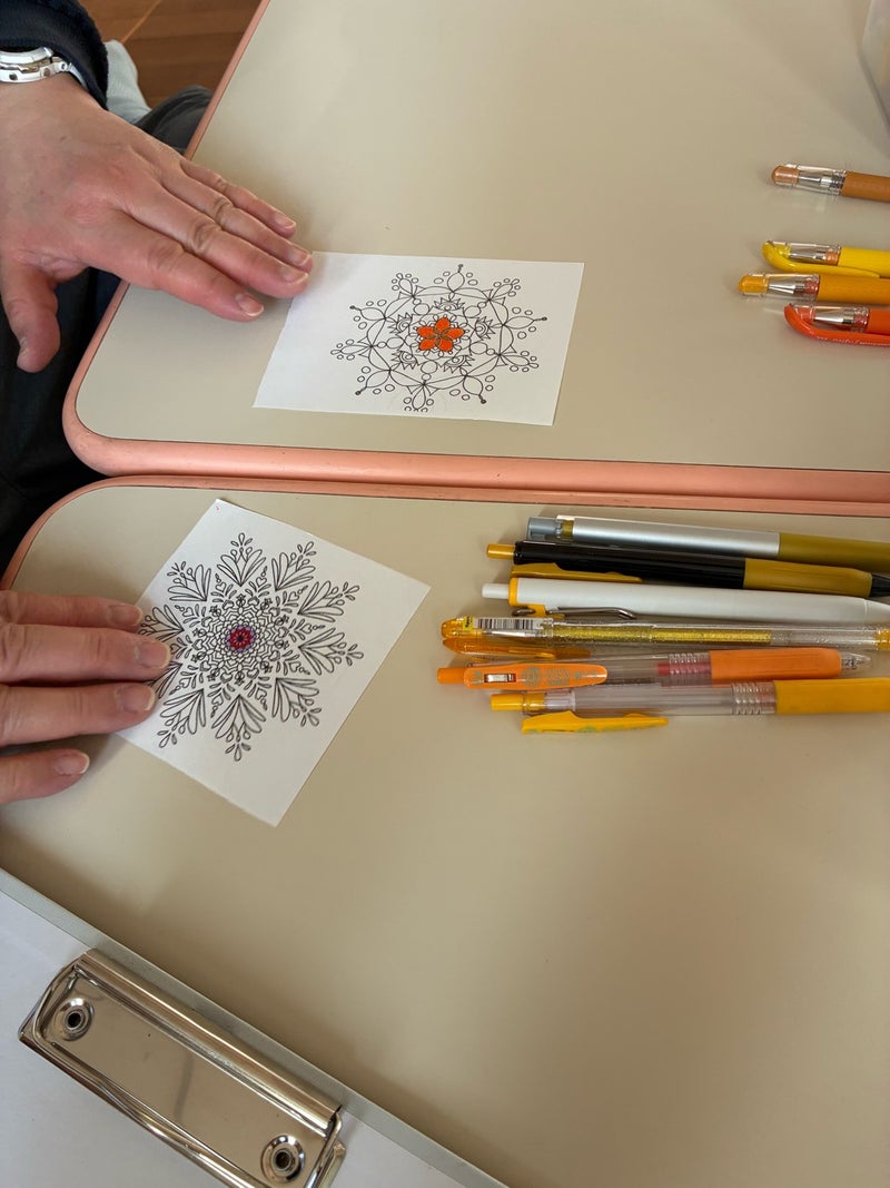 この日はものづくりの資材作りをしようと思っていたけど曼荼羅塗り絵をしたくなったのでたくさんの画材と塗り絵を持って会場へ!